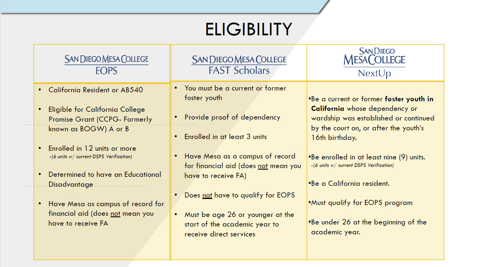 Presentations: Disability Support Programs & Services Free Legal Immigration Services USAW Save the Date[BROKEN LINK] Student Success & Equity Resources SD Mesa Veteran Services - Facebook