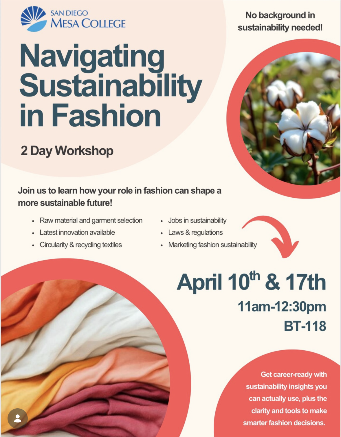 Join this free 2 day workshop on April 10 and 17 from 11:00 AM to 12:30 PM in BT-118 to explore sustainable fashion, industry insights, and your role in shaping the future.