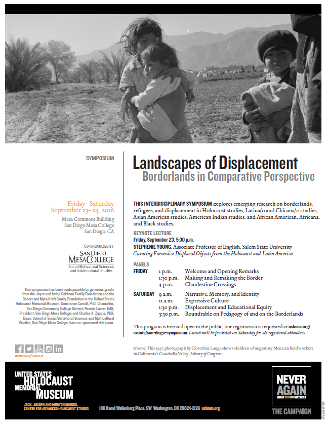 This interdisciplinary Symposium explores emerging research on borderlands, refugees, and and displacement in Holocaust studies, Latina/o and Chicana/o studies, Asian American studies, American Indian studies and African America, Africana, and Black studies