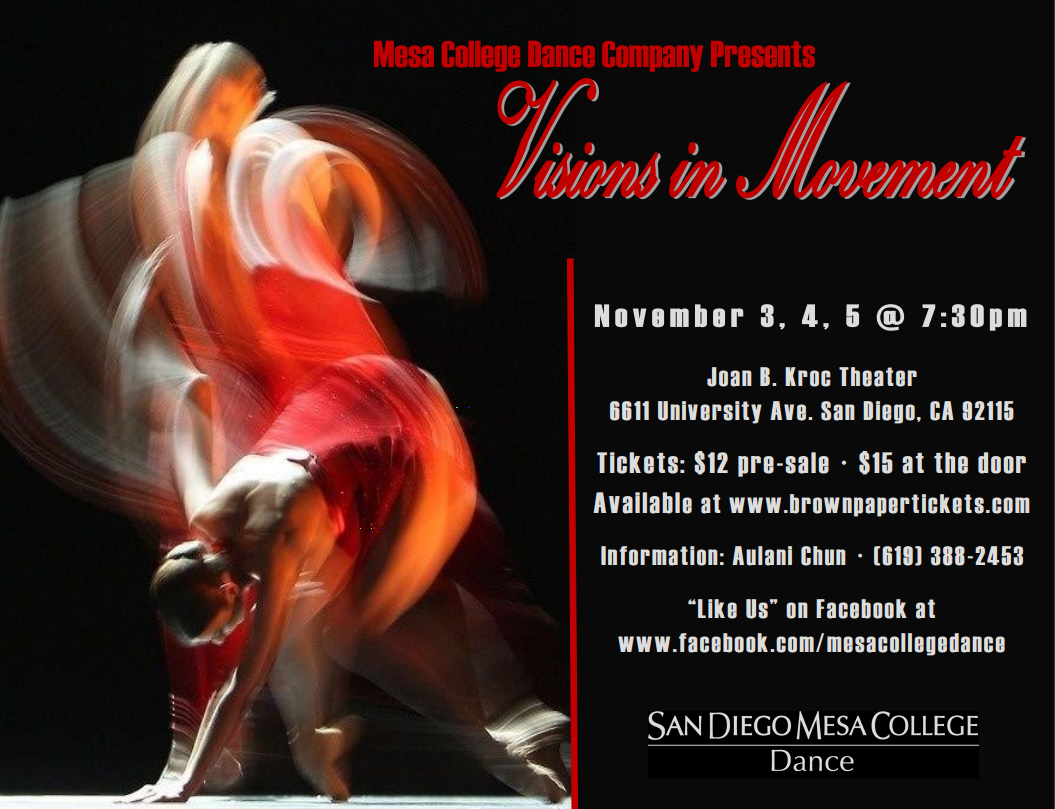 The Mesa College Dance Company invites you to their "Visions in Movement" Dance Concert at the Joan B. Kroc Theater. Presale tickets are $12 and can be purchased online at Brown Paper Tickets, or they can be purchased at the door for $15.