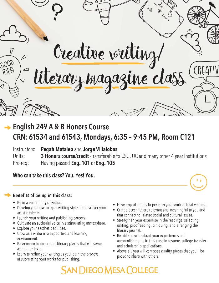 We are also promoting the English 249 A & B Honors Course, the creative writing magazine class. Anyone interested in taking the class is more than welcome! (more info on flyer in website link below)