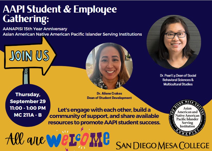 Please join us in the AAPI Student and Employee Gathering event scheduled for Thursday, 9/29, from 11:00 AM to 1:00 PM in MC 211A-B
