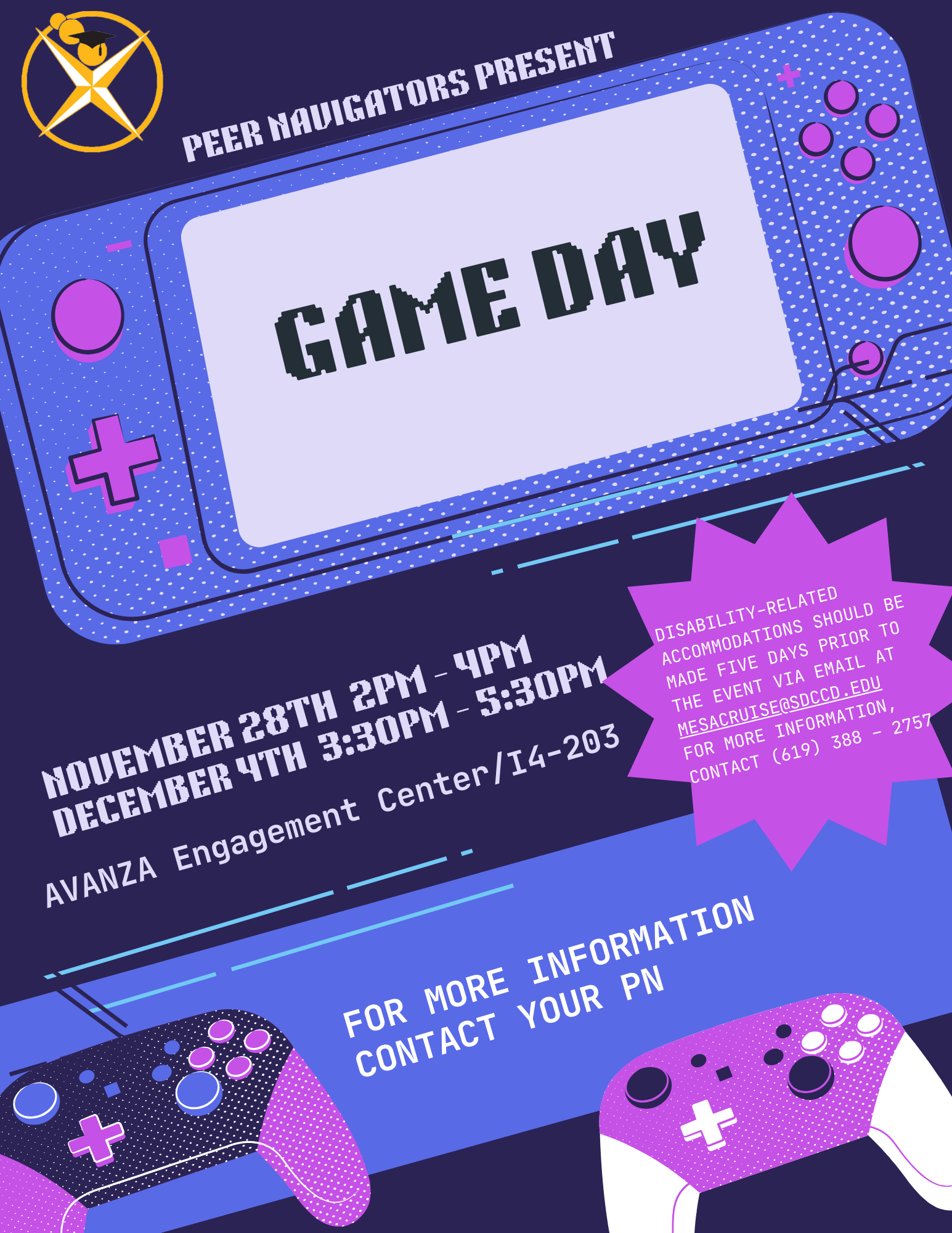 The Peer Navigator Program is hosting a Game Day on Monday, December 4 from 3:30pm - 5:30pm. Join the Peer Navigators for board games and fun! Game Day will be held in the AVANZA Engagement Center (I4-203). All are welcome!