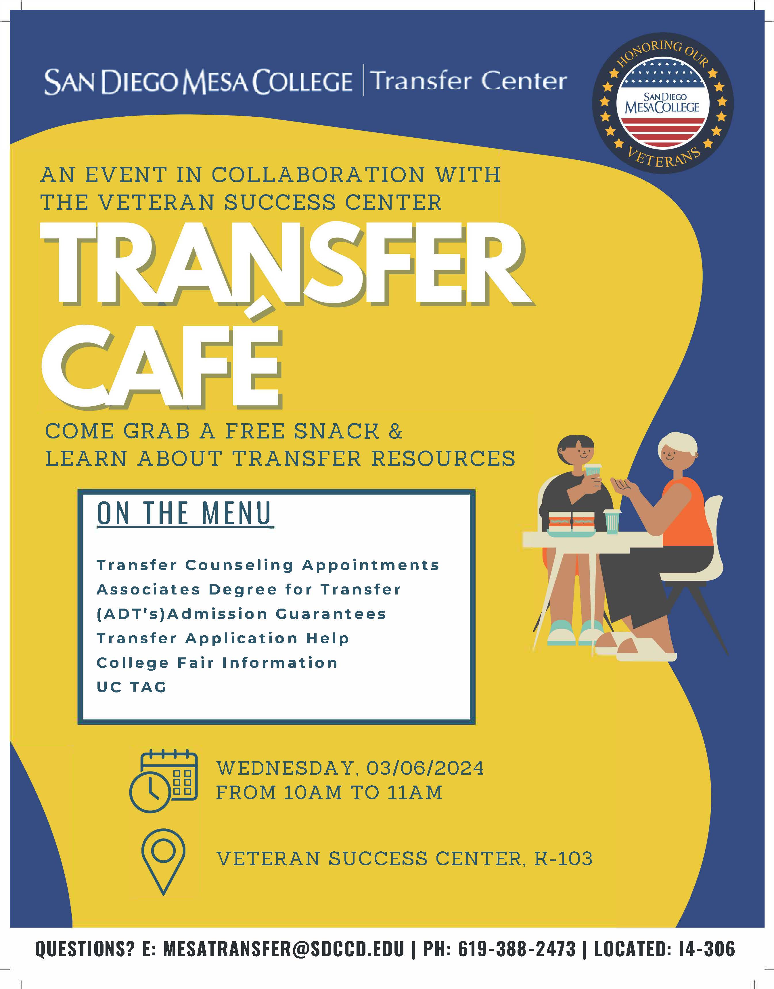 Join us this Wednesday, March 6th from 10 am to 11 am in the Veterans Success Center for our very first Transfer Cafe!