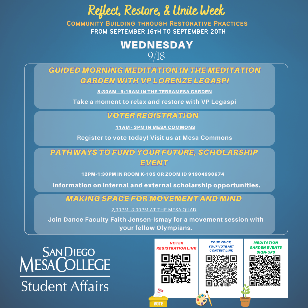 Register to vote today! Visit us at Mesa Commons. Pathways to Fund Your Future: Scholarship Event, 12pm - 1:30pm, Room K-105/Zoom ID: 91904990674