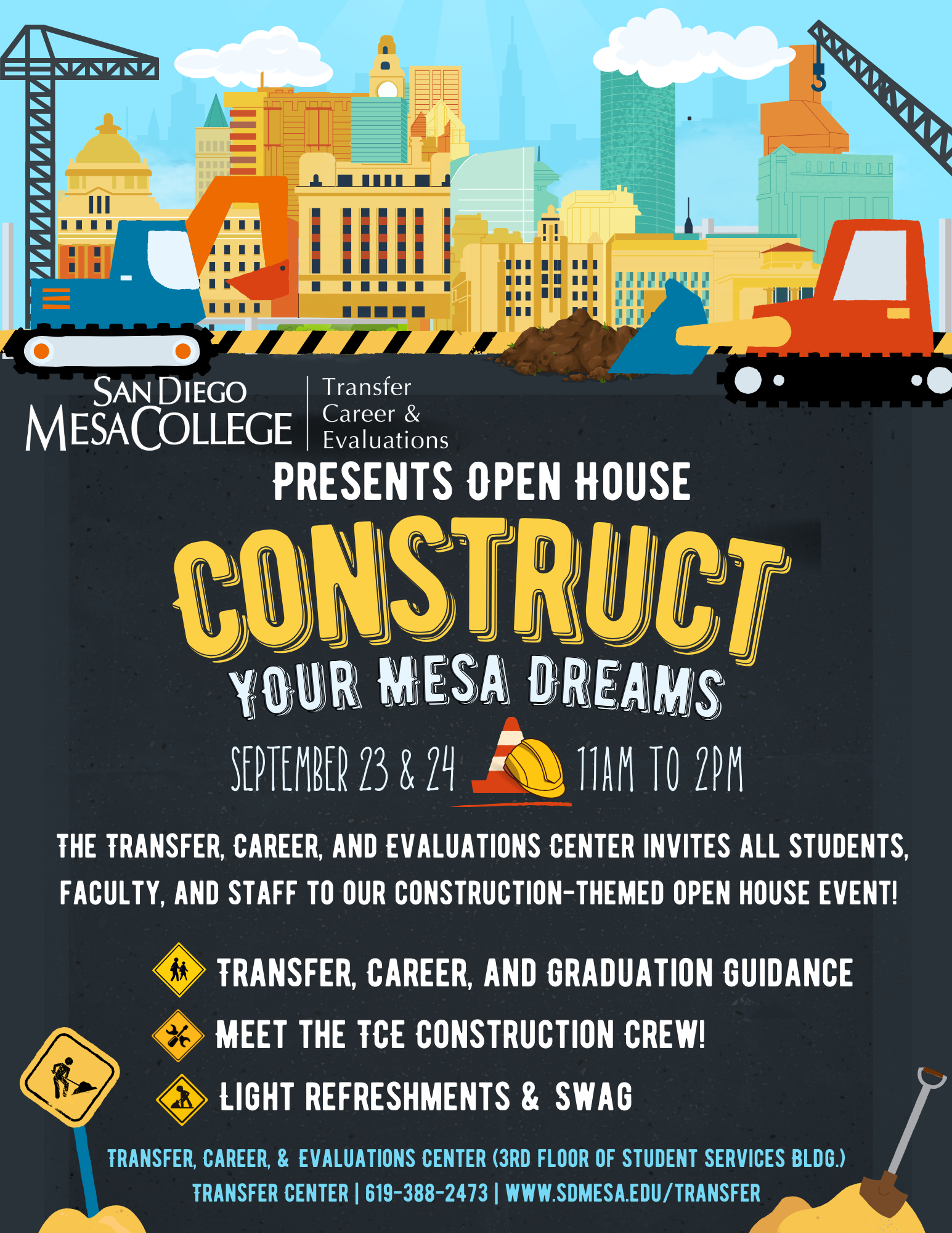 Exciting times await as we invite you to TCE’s Open House 'Construct Your Mesa Dreams' �" an event open to all students, faculty, staff, and administrators! We're excited to invite you to our open house offered two days of the week featuring different stations covering transfer success, career exploration, and the journey towards graduation. We encourage you to visit our space with your teams and take a picture at our photo booth!