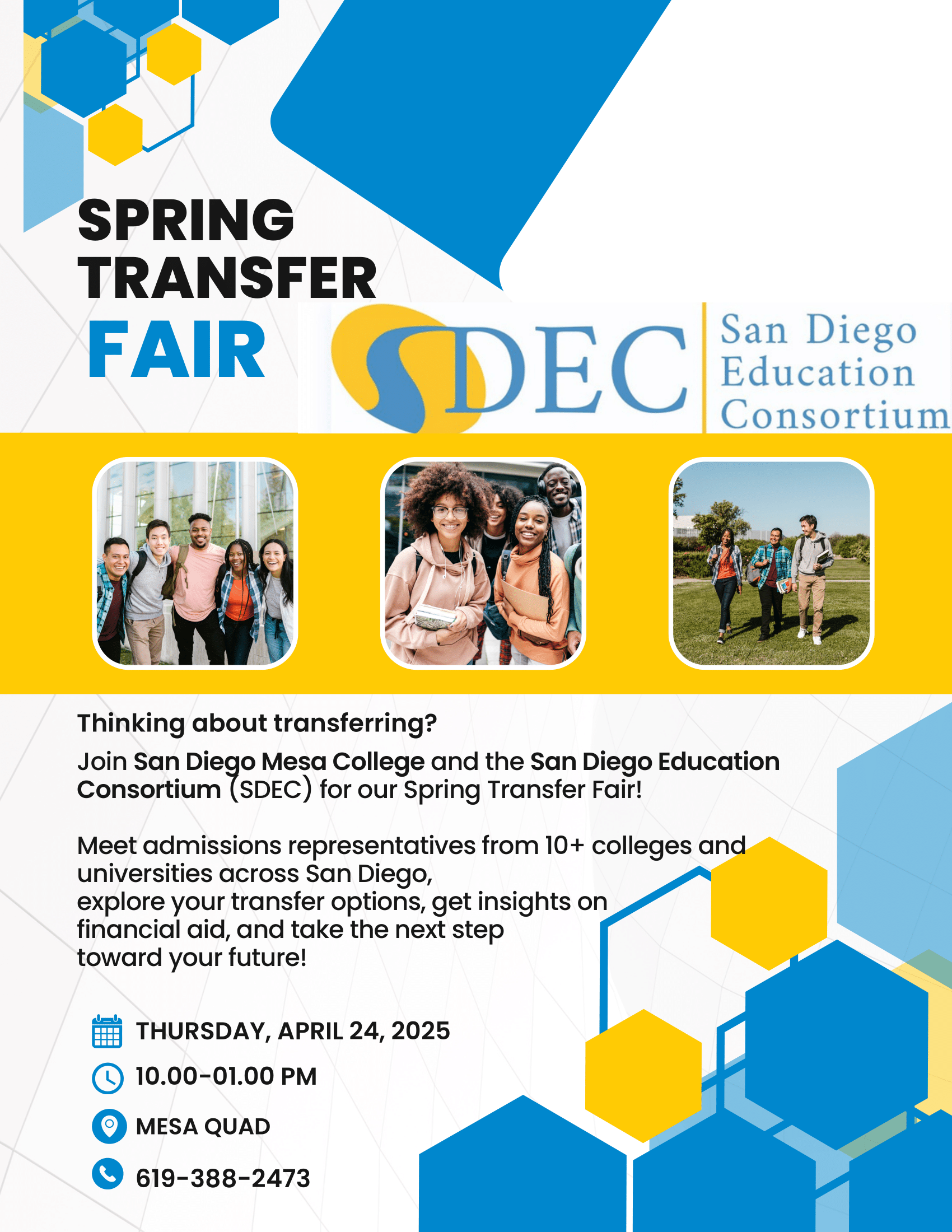 Thinking about transferring? THURSDAY, APRIL 24, 2025 10.00-01.00 PM Join San Diego Mesa College and the San Diego Education Consortium (SDEC) for our Spring Transfer Fair! Meet admissions representatives from 10+ colleges and universities across San Diego, explore your transfer options, get insights on financial aid, and take the next step toward your future!