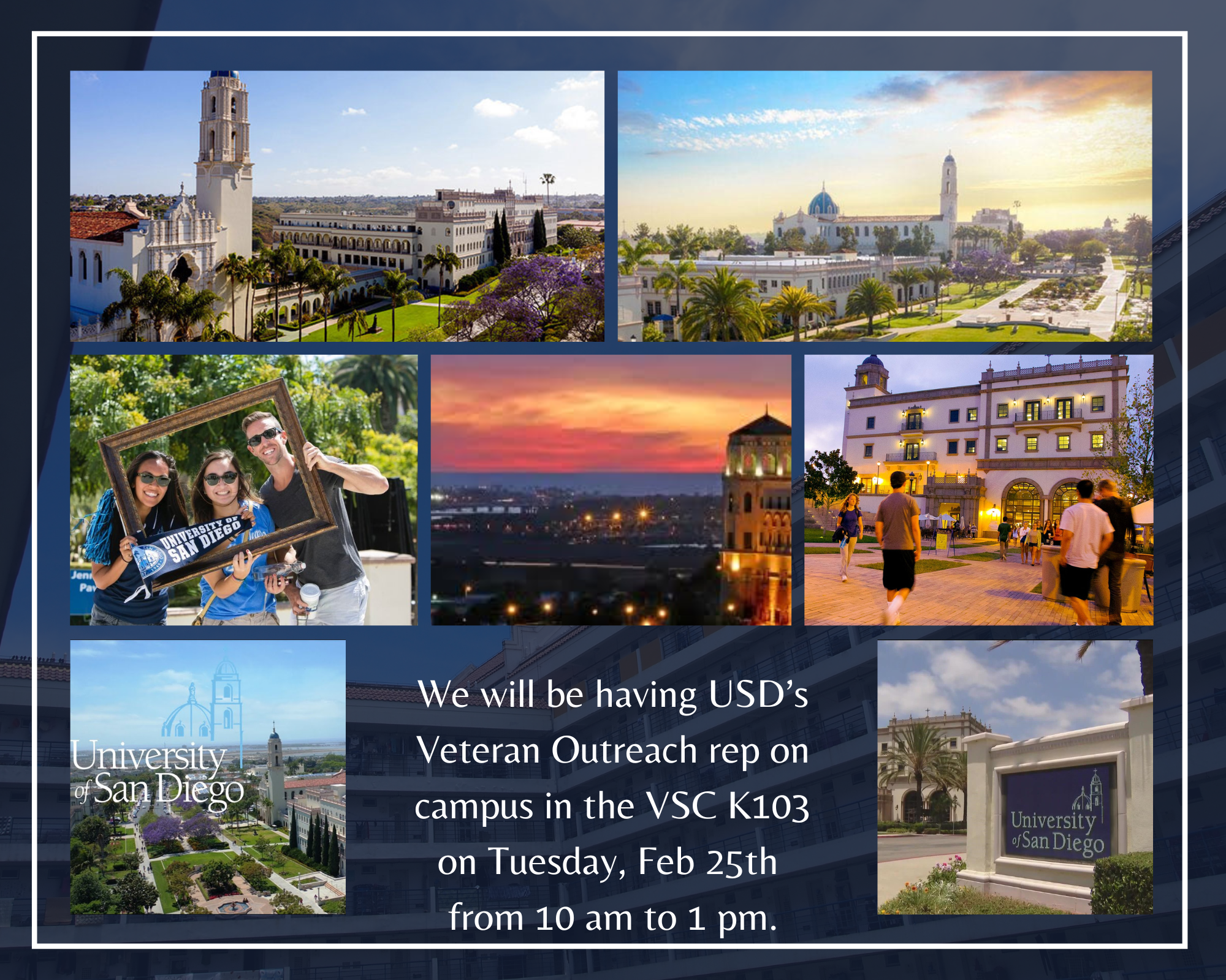 We will be having the University of San Diego’s Veteran Outreach representative on campus in the Veterans Success Center (K103) on Tuesday, Feb 25th from 10 am to 1 pm to answer all of your questions about the admissions/transfer process, as well as talk about various resources and support that is available for you as a military-affiliated student.