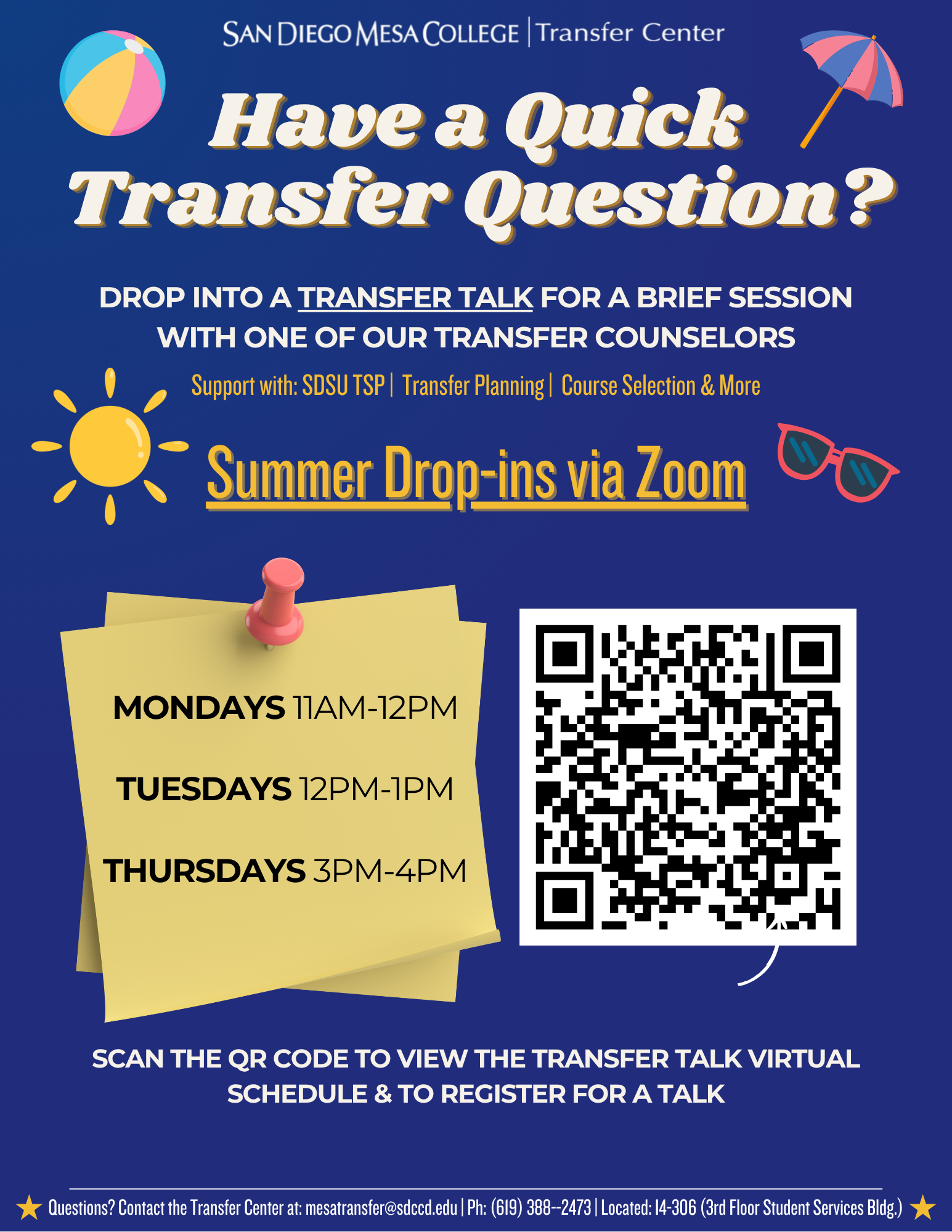 Join our Transfer Talks to get your transfer questions answered. Transfer counselors and transfer center staff will provide essential transfer information. REGISTER HERE!