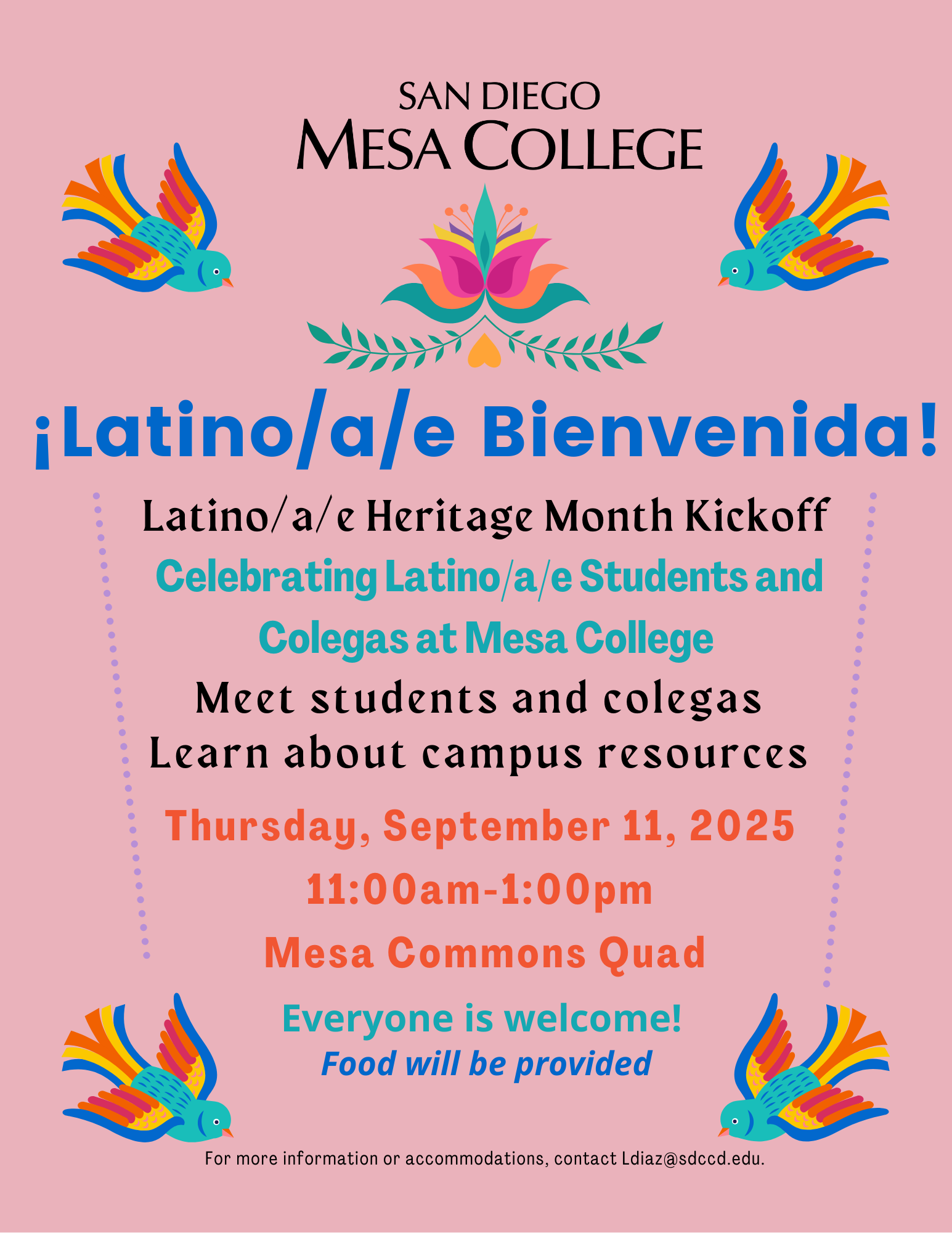 Latino/a/e Heritage Month Kickoff Celebrating Latino/a/e Students and Colegas at Mesa College. Meet students and colegas. Learn about campus resources. Thursday, September 11, 2025 from 11:00am-1:00pm at Mesa Commons Quad. Everyone is welcome! Food will be provided