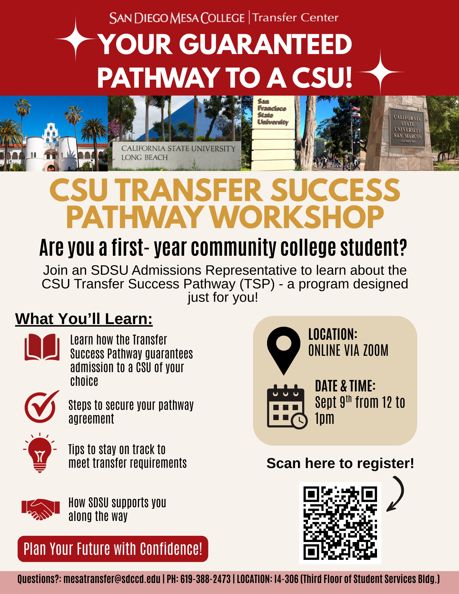 Join an SDSU Admissions Representative to learn about the CSU Transfer Success Pathway (TSP) - a program designed just for you!