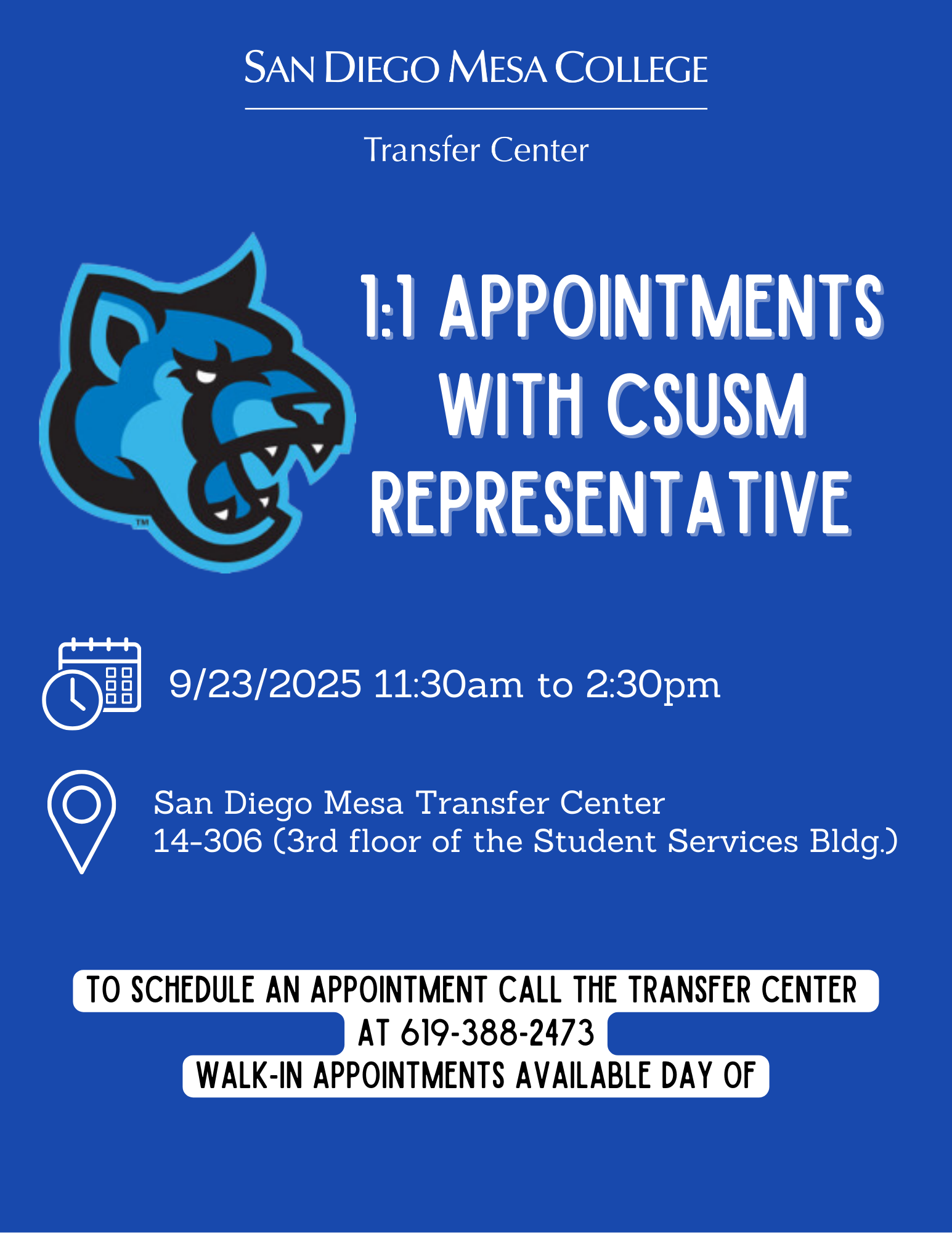 To schedule a 15 minute appointment with the representative, please connect with the Transfer Center in person or over the phone at 619-388-2473.