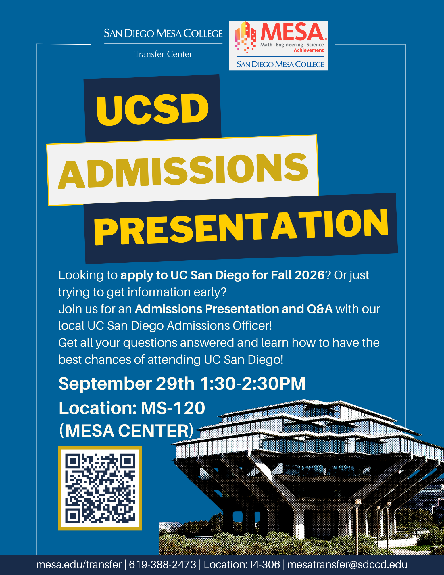 Looking to apply to UC San Diego for Fall 2026? Or just trying to get information early? Join us for an Admissions Presentation and Q&A with our local UC San Diego Admissions Officer!