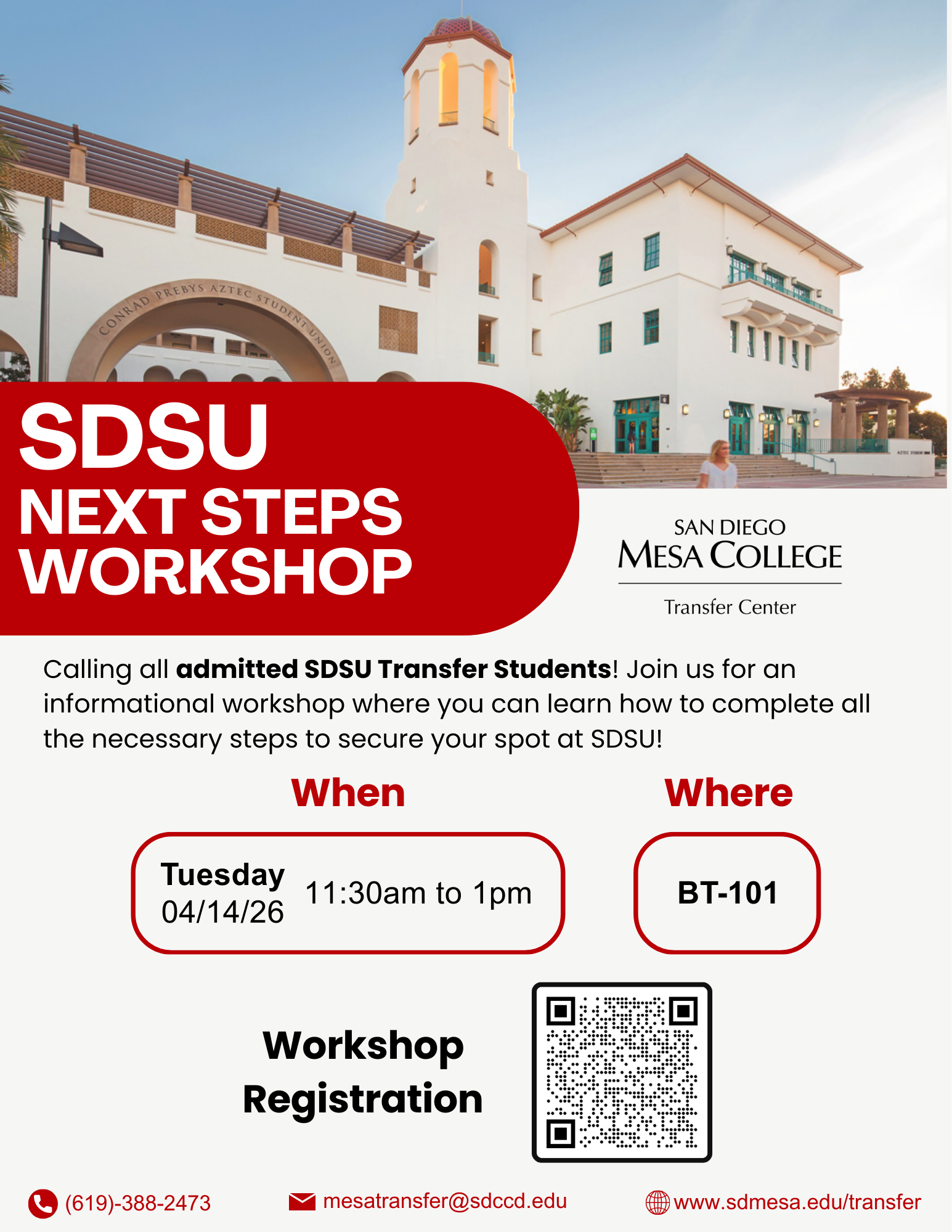 Calling all admitted SDSU Transfer Students! Join us for an informational workshop where you can learn how to complete all the necessary steps to secure your spot at SDSU!